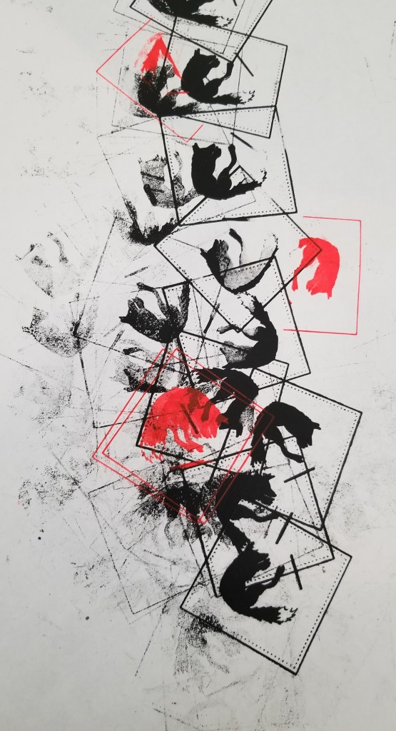 ‘Falling Foxes’ April 10, 2019 fennec81 Single print. Made with silkscreen, fabric ink, and acrylics. On news print paper 7.5″x20″-contact for pricing- Share this: Click to share on X (Opens in new window) X Click to share on Facebook (Opens in new window) Facebook Like Loading... Related